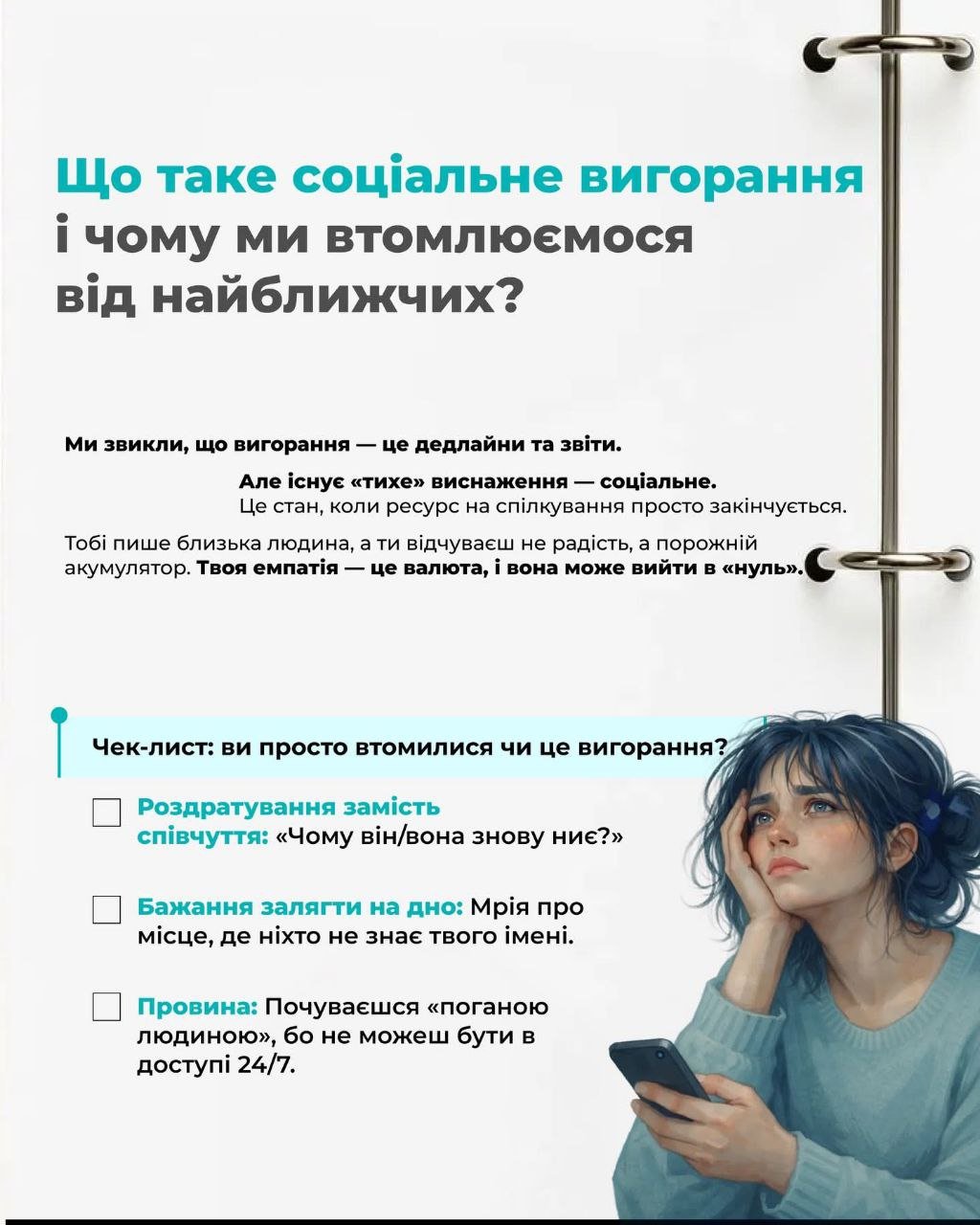 Іноді виснажує не робота — а розмови, постійна включеність, потреба бути поруч і підтримувати інших, коли власний ресурс уже на нулі. 👉 Це називається соціальне вигорання. Тихе, непомітне, але дуже реальне.