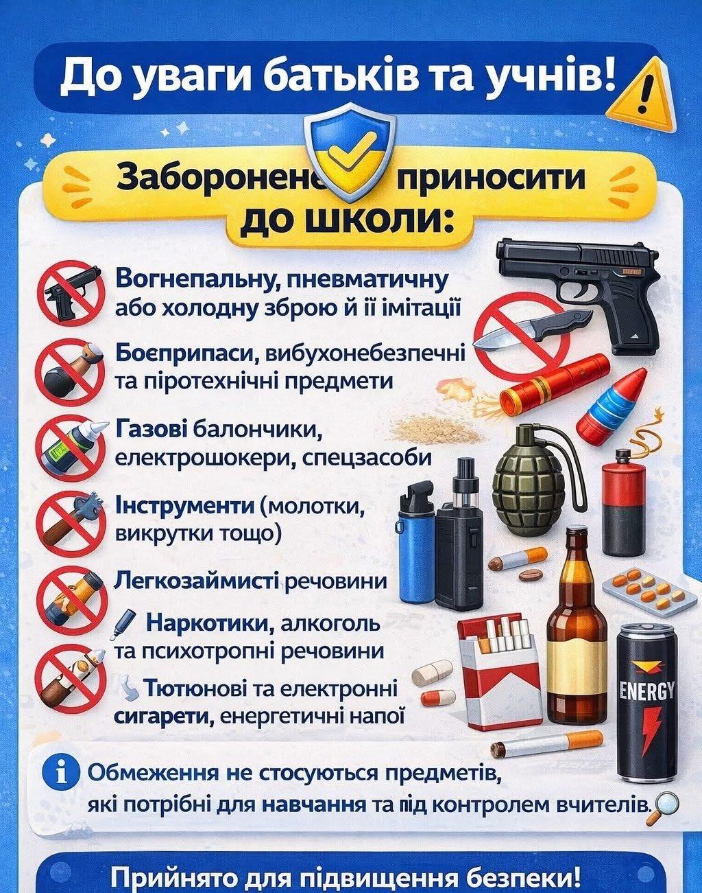 Кабінет Міністрів України затвердив перелік небезпечних предметів і речовин, з якими заборонено перебувати на території та в приміщеннях закладів загальної середньої освіти.