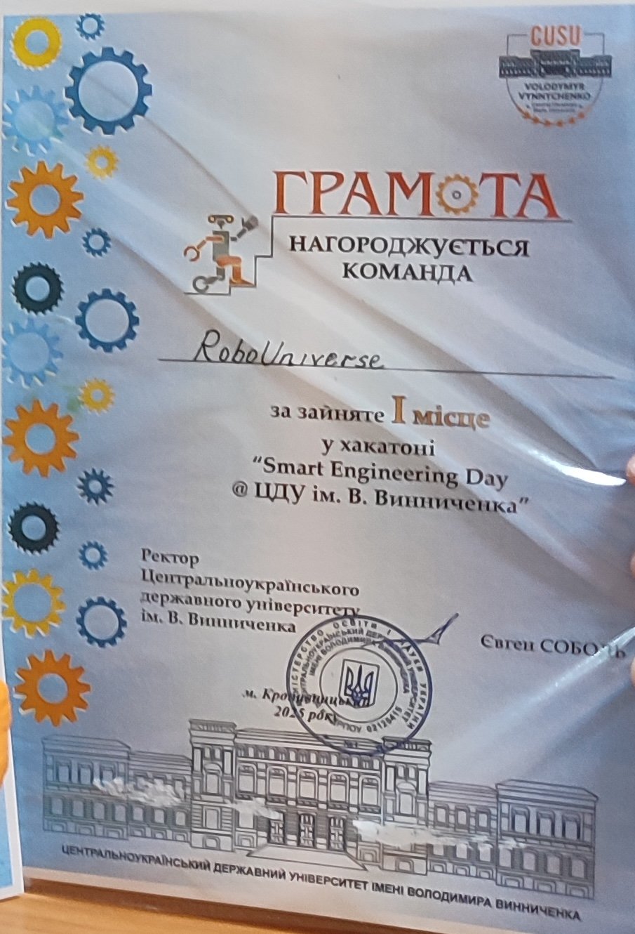 30 жовтня в м.Кропивницький відбувся хакатон «Smart Engineering Day @ ЦДУ ім. В. Винниченка», в якому брала участь наша команда «RoboUniverse» (Завертайло Андрій, Метошоп Ростислав, Смолянінов Богдан, керівник команди Хомутенко М.В.). Хакатон проводився в очному та дистанційному форматі.
